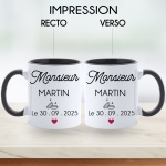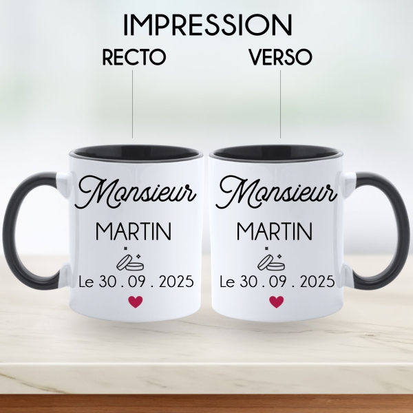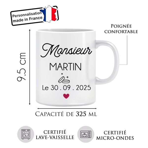 Pour célébrer un mariage ou marquer un anniversaire de mariage, personnalisez cette tasse avec les prénoms des mariés et une date spéciale. Idéale pour offrir aux jeunes mariés, aux témoins, ou même en tant que cadeau d'invité, cette tasse disponible en 7 coloris ajoutera une touche personnelle à cet événement inoubliable. Parfaite pour immortaliser un moment unique et créer un souvenir durable