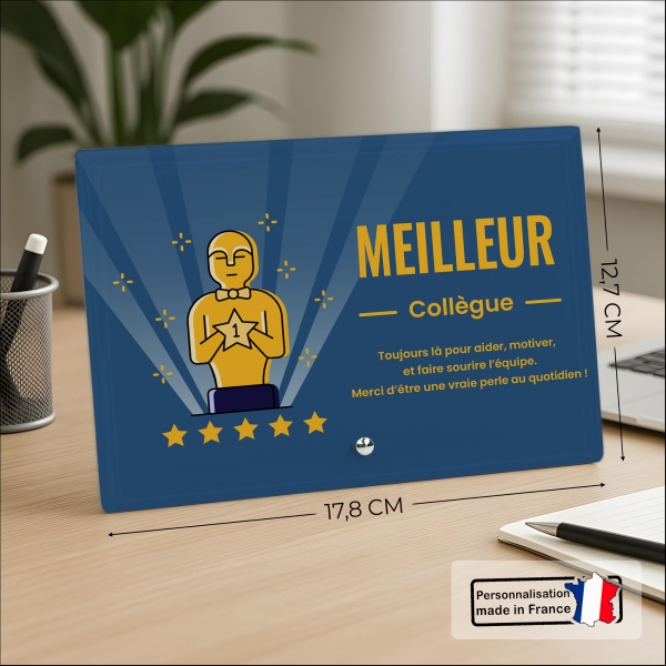 Célébrez le talent (et les blagues douteuses) de votre collègue préféré avec cette plaque personnalisée façon trophée Oscar ! Ce cadeau original fait toujours son petit effet lors des pots de départ, anniversaires ou moments de team building. Un cadeau d’entreprise personnalisé parfait pour mettre l’ambiance et valoriser les collègues avec humour et originalité.