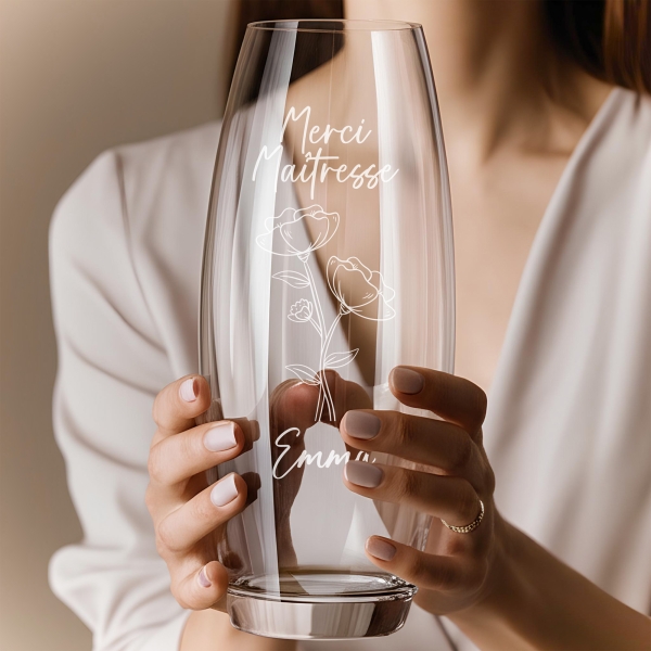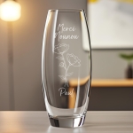 Notre vase bombé en verre personnalisé est le cadeau idéal pour célébrer un mariage, un anniversaire, remercier une maîtresse ou une nounou. Grâce à la gravure directement sur le verre, chaque vase devient un objet unique, personnalisé selon vos souhaits. Élégant et classique, il peut accompagner tout style intérieur.