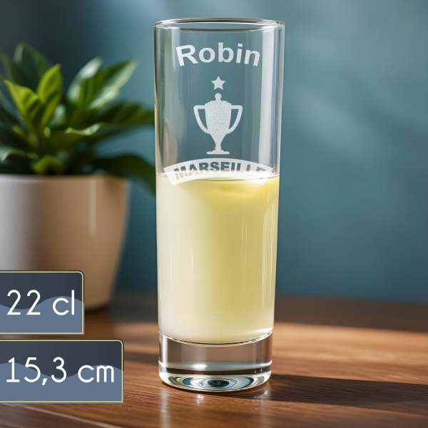 Voici le cadeau parfait pour tous les inconditionnels de la fameuse boisson anisée : les amateurs de Pastis ou de Ricard seront comblés ! Personnalisez ce verre "Marseille" pour les fans de foot et de l'OM avec le texte de votre choix pour un cadeau unique en son genre. Toutes les occasions sont bonnes pour offrir ce verre !