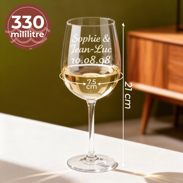 Découvrez notre verre à vin personnalisé, gravé avec soin avec votre texte pour une touche unique. Parfait comme idée cadeau, ce verre élégant et sophistiqué rendra chaque occasion mémorable : anniversaire, Noël, mariage... Offrez un souvenir durable avec un verre à vin gravé, idéal pour les amateurs ou les connaisseurs de vin.